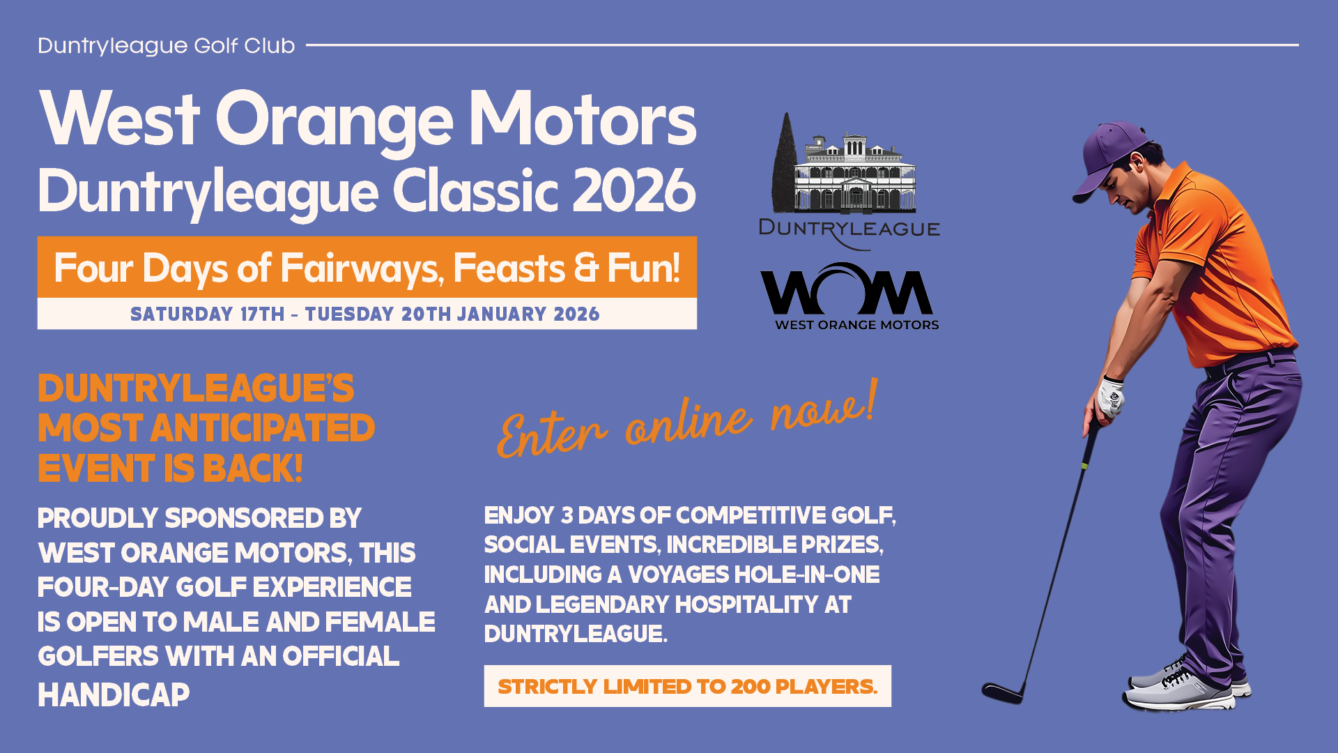West Orange Motors Duntryleague Classic 2026 West Orange Motors Duntryleague Classic 2026 Saturday 17th January - Tuesday 20th January 2026 Four Days of Fairways, Feasts & Fun!